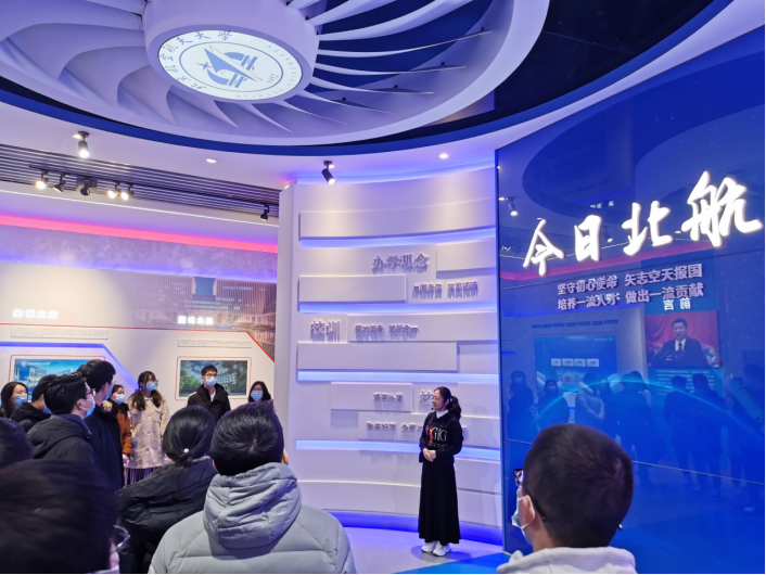 BY1903班组织了以“今日北航”为主题的党团共建活动,旨在让班级同学了解北航历史,关注北航发展,进而增强同学们潜心科研、空天报国的决心。下午三时许,班长陈炼在航空航天博物馆门前组织本班同学做健康登记后,由馆内工作人员带领进入二楼“今日北航”展区。在当前国内新冠疫情好转的情况下,我们依旧没有放松警惕,整个参观过程均佩戴医用口罩以遏制流行病的传播途径。
