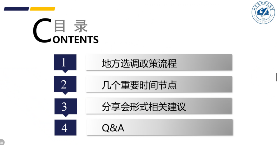 会议主要分为以下四个部分:地方选调政策流程,重要时间节点,分享会形式相关建议,问答环节。