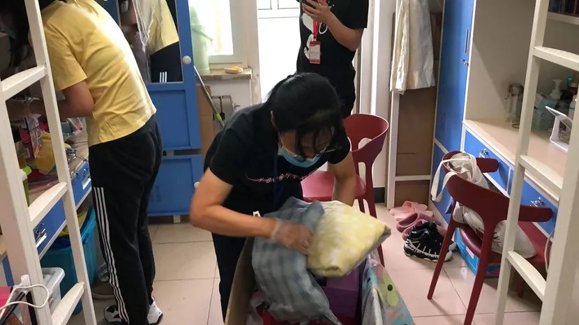 7月7日,“云打包”正式开始!顶着高温,所有参与行李打包寄送的工作人员爬上爬下、挥汗如雨,口罩盖的皮肤有些发红发烫,手上因多汗滑不动手机屏幕,但依然干劲十足,还念叨着“用胶带多缠几圈”、“绑紧点”,互相分享着“不要的被单可以用来包行李箱”、“书页统一朝上摆放不会扎破袋子”等等的打包心得。视频连线的毕业生们对老师们代为打包的暖心举动也表示深深的感谢,关心问候老师的身体,并表示不必要的物品不辛苦老师收拾,以当下流行的“极简”风格处理就好。