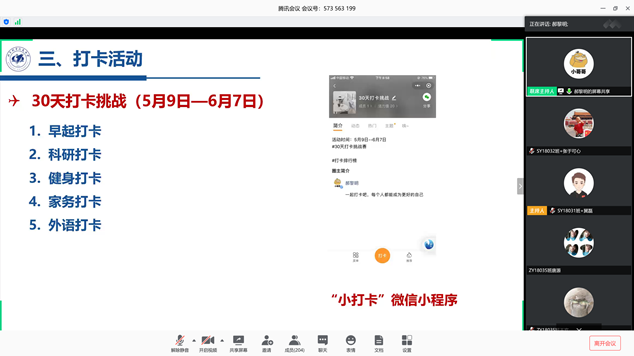 第三,为激励学生学习生活热情,举办《30天打卡挑战,寻找志同道合的你!》线上主题活动,包括5项挑战:早起打卡、科研打卡、健身打卡、家务打卡、外语打卡。七点前的一缕阳光,论文中的一丝灵感,运动后淋漓大汗等不仅是打卡的标志,更是为了遇见更美好的自己。
