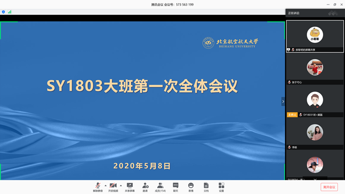 20205815时,183系全体学生在云端举行了抗疫主题班会,本次班会进行了三点强调,第一,防疫工作要常态化开展,可以适当参加户外运动,出门务必做好防护,目前尚无法返京返校,大家继续坚持。每位同学必须重视健康信息打卡,确保信息准确。