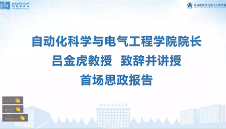 会议开场,院长吕金虎教授发表致辞,并向新生讲授首场思政报告。吕金虎院长热情欢迎同学们的到来,希望同学们立志报效祖国、锤炼品德修为、练就过硬本领。