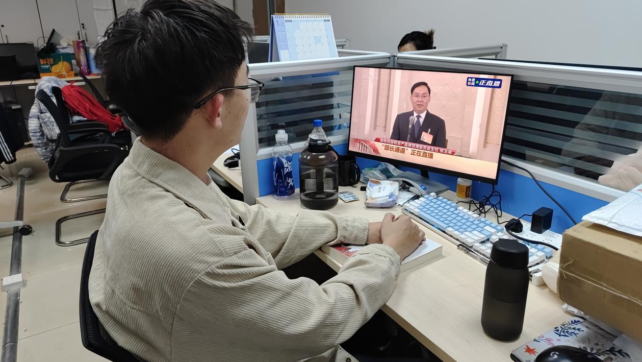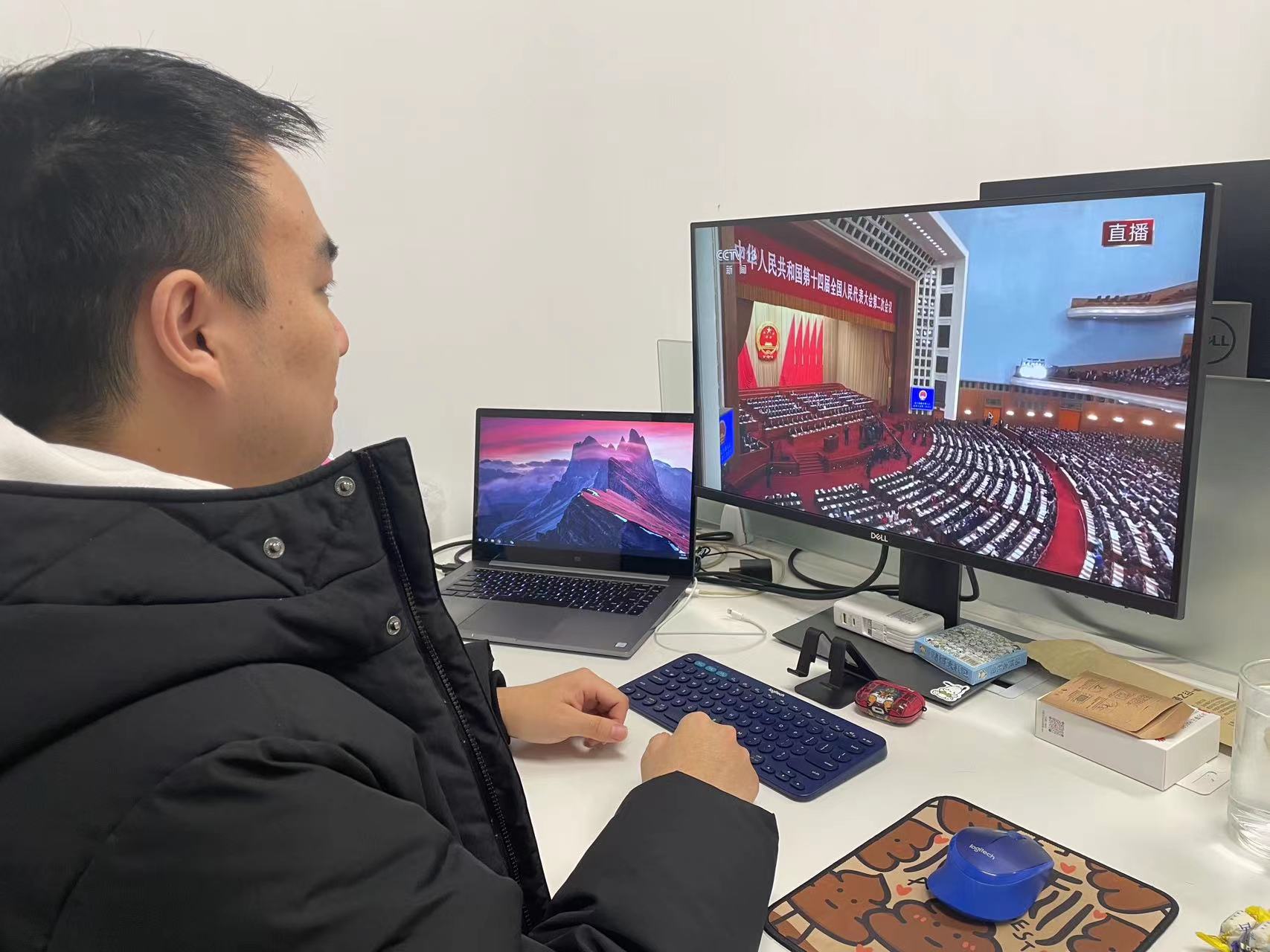 3月5日,十四届全国人大二次会议开幕,党支部一起观看并收听了李强总理做的政府工作报告。工作报告交出了过去一年的成绩单,也展示了我们国家日新月异的发展变化。科技领域欣欣向荣的发展态势,激励了我们广大学子应该勇担时代大任,勇挑时代大梁,努力学习,乘风破浪,不断积累科技文化知识,为中华民族伟大复兴添砖加瓦。