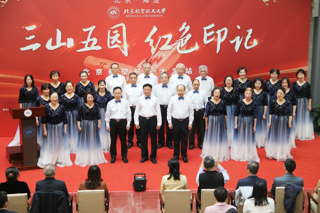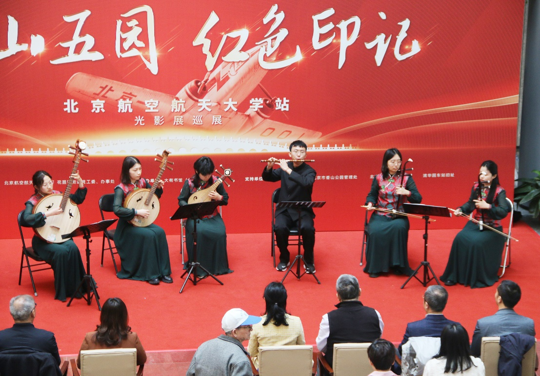 开幕式现场,北航学生艺术团学生带来民乐合奏《我和我的祖国》,北航离退休老师组成的航之韵合唱团演唱《向往》,北航老师和同学们用精彩的节目表达了对祖国的热爱和深情。
