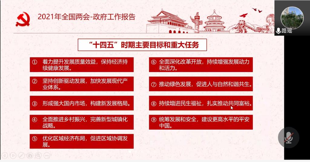 路遥同志首先梳理了李克强总理代表国务院在十三届全国人大四次会议上的政府工作报告。报告回顾了过去的一年政府的主要工作,总结“十三五”时期发展成就,提出“十四五”时期主要目标和重大任务,并提出2021年的重点工作和发展预期目标。接着,路遥同志带领大家学习了全国人民代表大会关于完善香港特别行政区选举制度的决定,该决定为保证“落实爱国者治港”提供了制度保障。