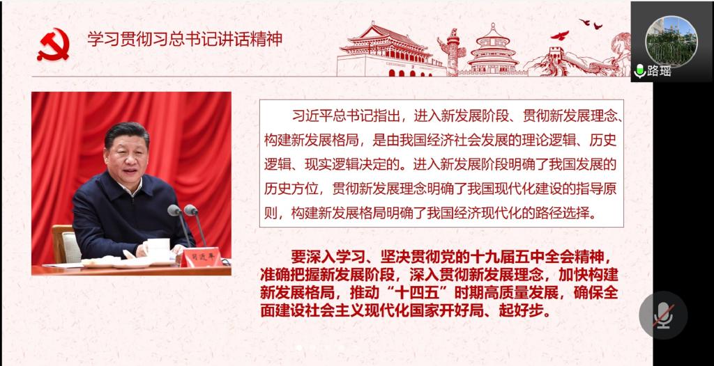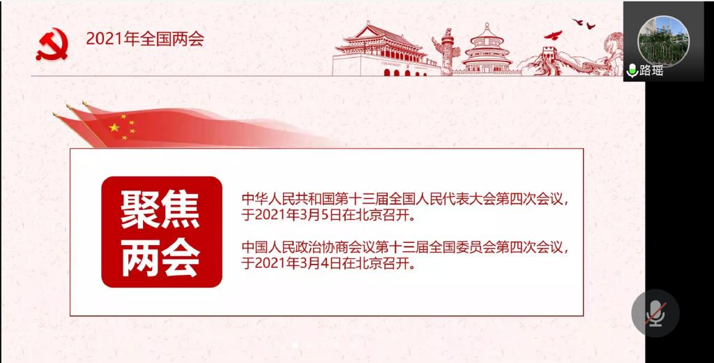 本次活动主要的学习内容包括三部分,一是两会相关内容,二是习近平总书记在省部级主要领导干部学习贯彻党的十九届五中全会精神专题研讨班开班式上的讲话,三是近期新闻分享。