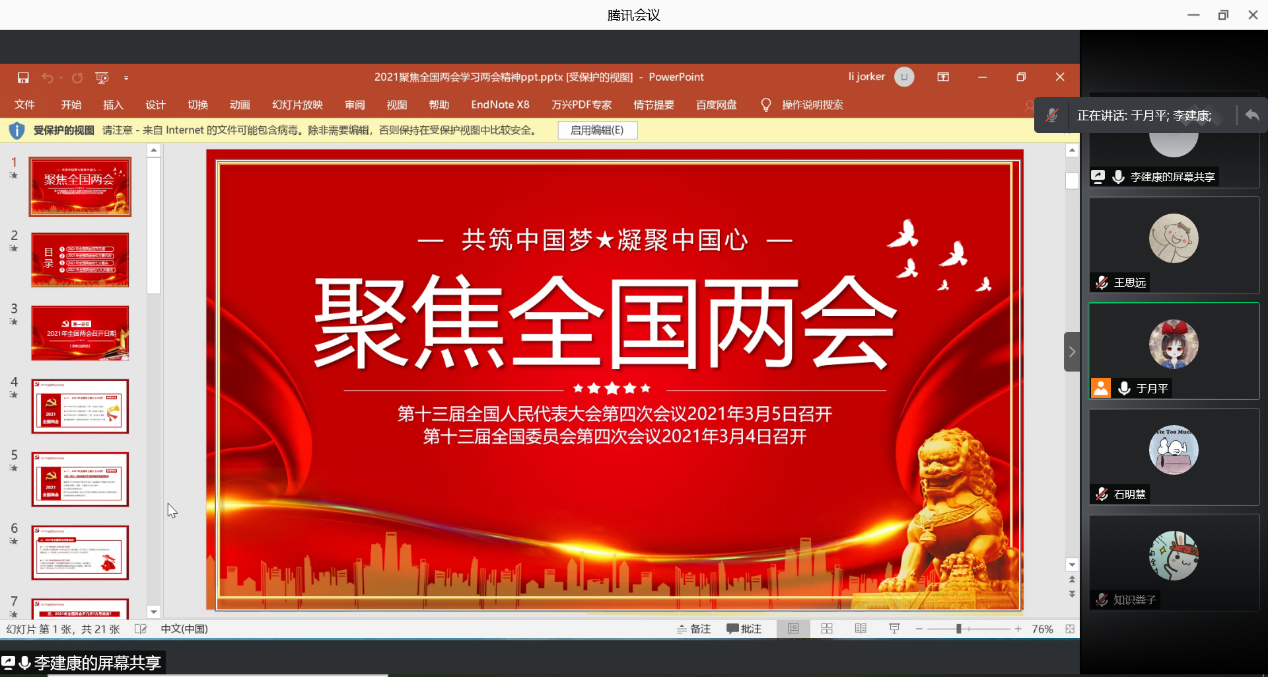 2021年3月17日,SY1903第六党支部在腾讯会议上,以“聚焦全国两会”为主题开展集中学习。会议由支部书记于月平主持、李健康同志作为主讲人进行,会议应到11人,实到11人。