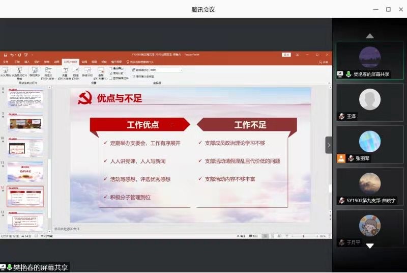 支部进行述职,作为新生党支部,各位党支书展示了自支部成立以来的工作成果,也将之后的支部建设工作做出规划,对支部建设现存的问题进行了总结,提出相应的解决措施。