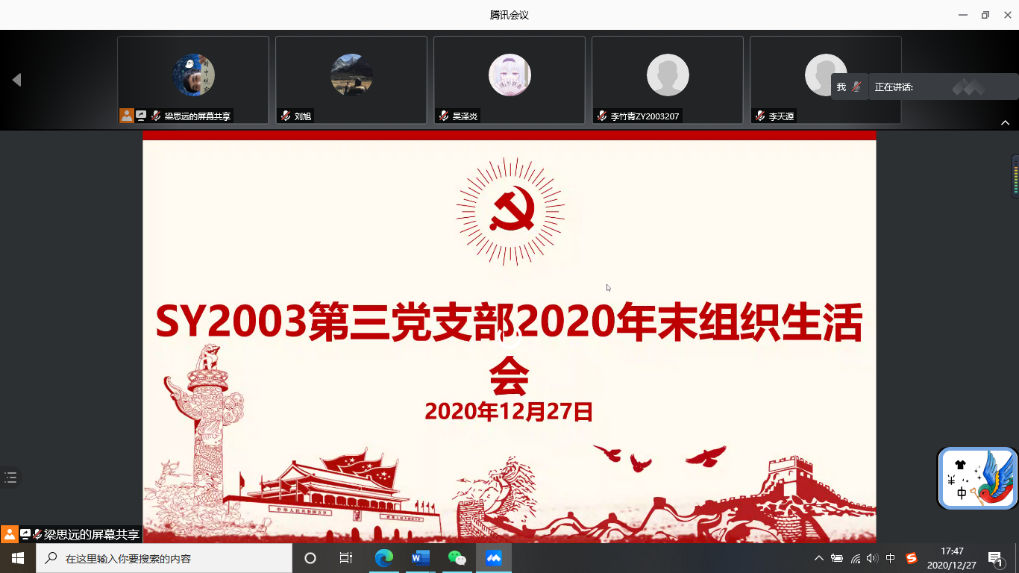 SY2003第三党支部于12月27日16:00通过线上方式开展了2020年末组织生活会。会议的主要内容是对2020年党支部主要工作回顾和总结,以及批评与自我批评环节。支部的12名正式党员与1名预备党员参与了本次活动。本次组织生活会在梁思远同志的主持下顺利开展,使各位党员对自身存在的问题有了深刻的反省,使党支部整体对下学期的整改方案有了更清晰的把握。
