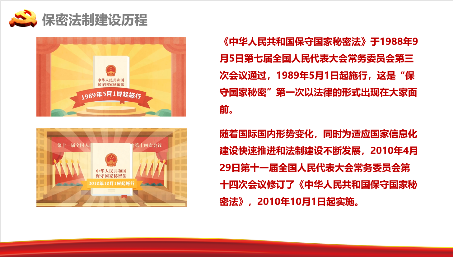 《中华人民共和国保守国家秘密法》于1988年9月5日第七届全国人民代表大会常务委员会第三次会议通过,1989年5月1日起施行。随着国际国内形势变化,同时为适应国家信息化建设快速推进和法制建设的不断发展,2010年4月29日第十一届全国人民代表大会常务委员会第十四次会议修订了《中华人民共和国保守国家秘密法》,2010年10月1日起实施。