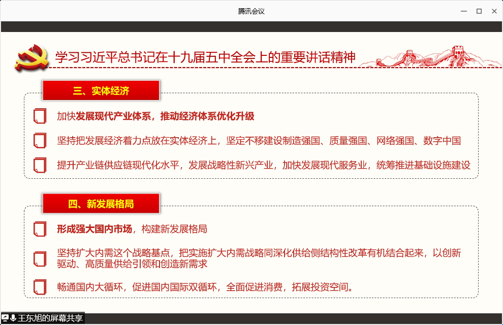 首先,王东旭同志带领大家学习了习近平总书记在十九届五中全会上的讲话精神。十九届五中全会提出了二零三五年基本实现现代的远景目标,本次党课围绕实体经济、新发展格局、有效市场和有为政府、新型工农城市关系、国家文化软实力等十四个关键词进行了学习。