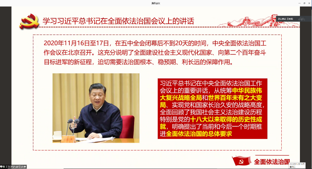 然后,王东旭同志带领大家学习了习近平总书记在全面依法治国会议上的讲话。该讲话从统筹中华民族伟大复兴战略全局和世界百年未有之大变局,到实现党和国家长治久安的战略高度,全面回顾了我国社会主义发至建设历程特别是党的十八大以来取得的历史性成就,明确提出了当前和今后一个时期推进全面依法治国总要求。