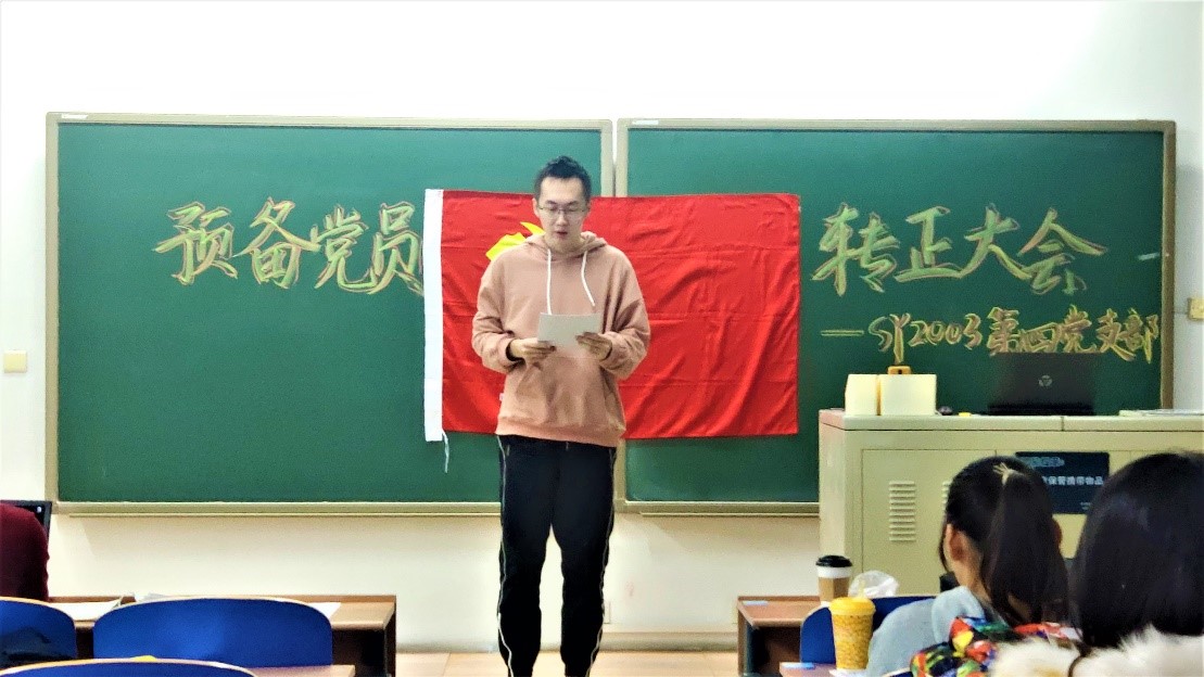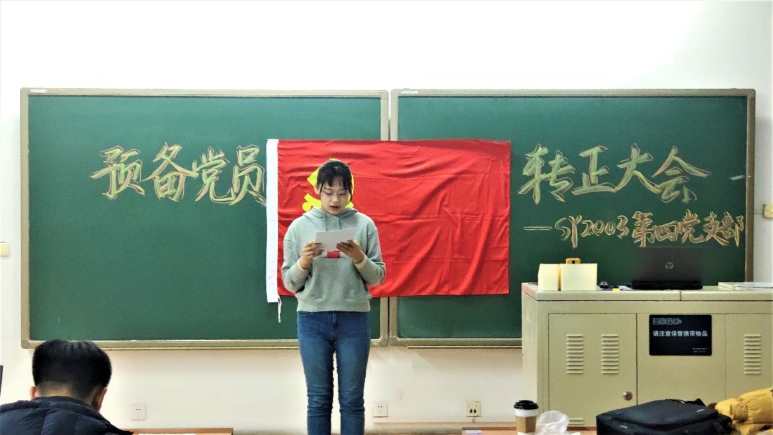 SY2003第四党支部预备党员转正大会在E207教室顺利召开,大会由支部书记姜琳琳同志主持。
