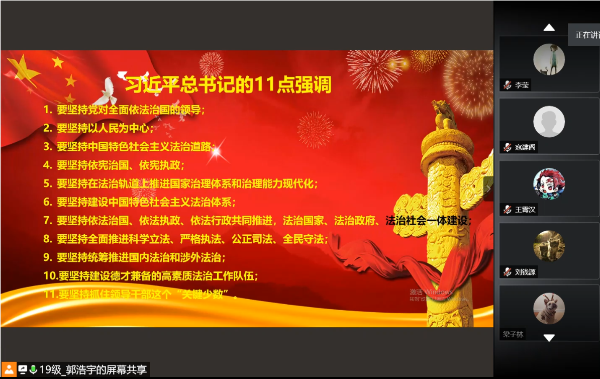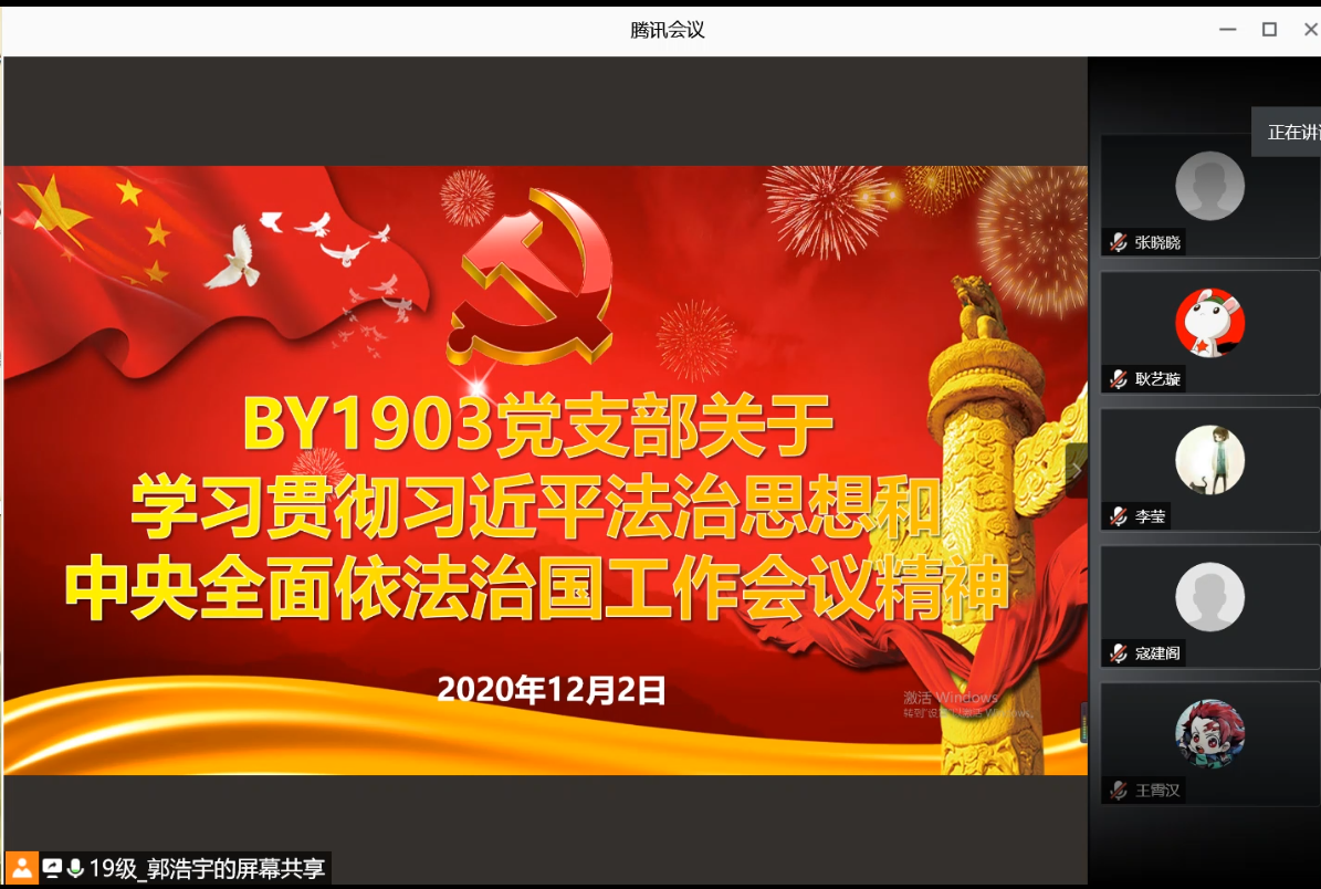 BY1903党支部利用腾讯会议线上共同开展了“不忘初心、牢记使命——贯彻法治思想和中央全面依法治国工作会议精神”主题学习。会议由BY1903党支部书记郭浩宇同志主持。支部应与会党员37人,实与会党员34人。