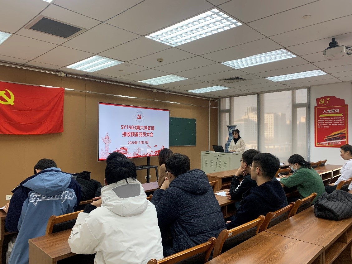 2020年11月25日,SY1903第六党支部在新主楼E座706召开支部会议,会议内容主要分成两个部分:预备党员转正与接收预备党员。