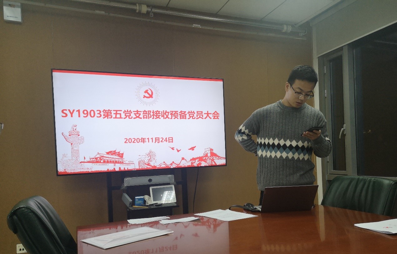 SY1903第五党支部在新主楼E804顺利召开关于讨论接收郭丽新、林则全和赵志慧同志成为预备党员的会议。
