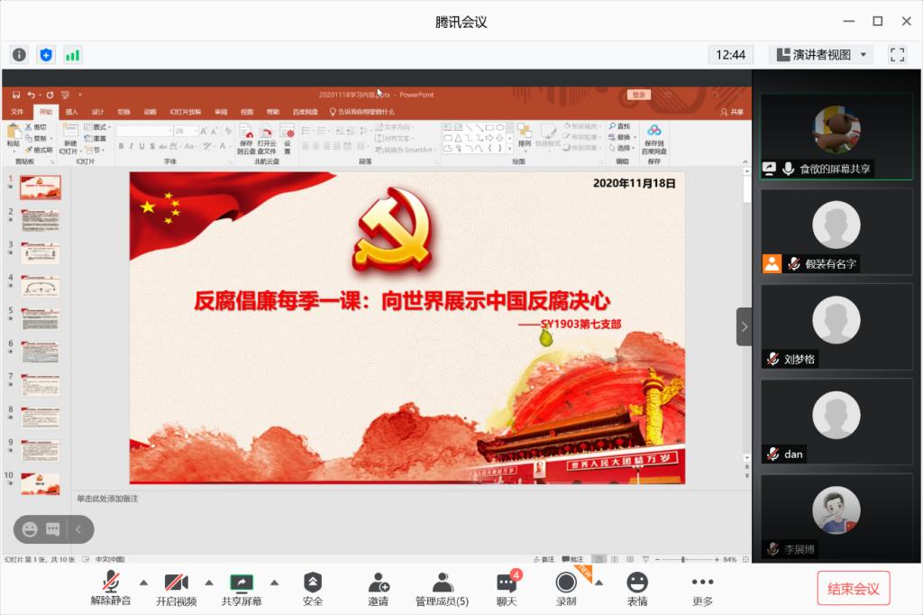 SY1903第七党支部通过腾讯会议,召开了反腐倡廉每季一课。本次活动由陈施宇同志主讲,SY1903第七党支部全体党员参加了本次学习日活动。