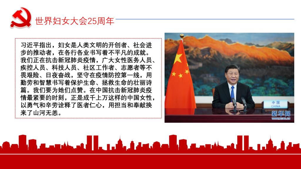 接下来,刘偲同志带领大家学习了习近平总书记纪念北京世界妇女大会25周年高级别会议讲话。随着妇女地位的提高,“半边天”作用日益彰显。习近平总书记提出4点主张:1、帮助妇女摆脱疫情影响;2、让性别平等落到实处;3、推动妇女走在时代前列;4、加强全球妇女事业合作。妇女是人类文明的开创者、社会进步的推动者,在各行各业书写着不平凡的成就。我们正在抗击新冠肺炎疫情,广大女性医务人员、疾控人员、科技人员、社区工作者、志愿者等不畏艰险、日夜奋战,坚守在疫情防控第一线,用勤劳和智慧书写着保护生命、拯救生命的壮丽诗篇。在中国抗击新冠肺炎疫情最紧要的时刻,正是成千上万这样的中国女性,以勇气和辛劳诠释了医者仁心,用担当和奉献换来了山河无恙。