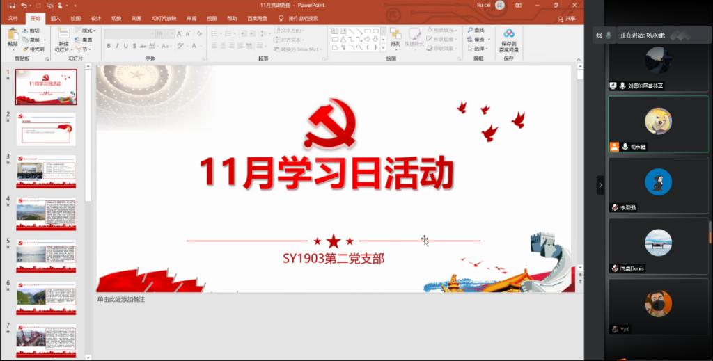 2020年11月4日,SY1903第二党支部通过腾讯会议线上开展“学习生态经济发展理念,关注性别平等问题”学习日活动。本次会议由党支部杨永健同志主持,刘偲同志主讲,共9名支部成员参与活动。