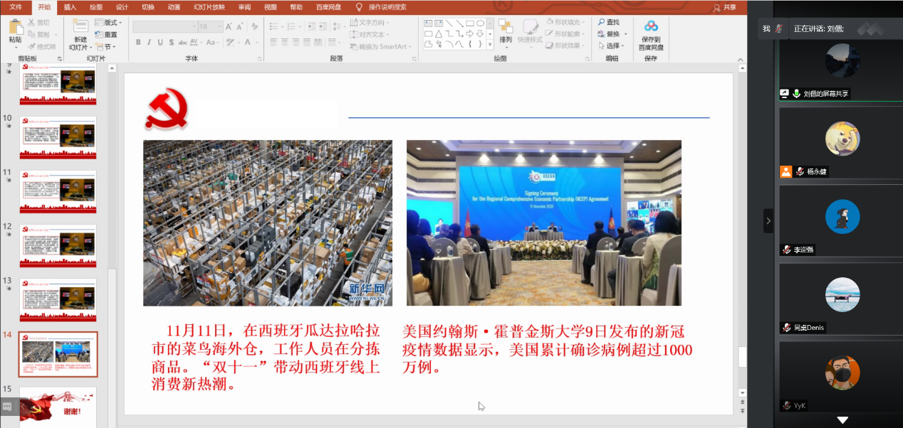 学习活动的最后,刘偲同学与大家分享的国内近期的重要新闻。重点介绍了近期签署的RCEP协定。第四次区域全面经济伙伴关系协定领导人会议11月15日举行,东盟十国以及中国、日本、韩国、澳大利亚、新西兰15个国家,正式签署区域全面经济伙伴关系协定(RCEP),标志着全球规模最大的自由贸易协定正式达成。签署RCEP,是地区国家以实际行动维护多边贸易体制、建设开放型世界经济的重要一步,对深化区域经济一体化、稳定全球经济具有标志性意义。刘偲同志表示,希望大家关心时事,结合时事加深对所学理论知识理解认识。