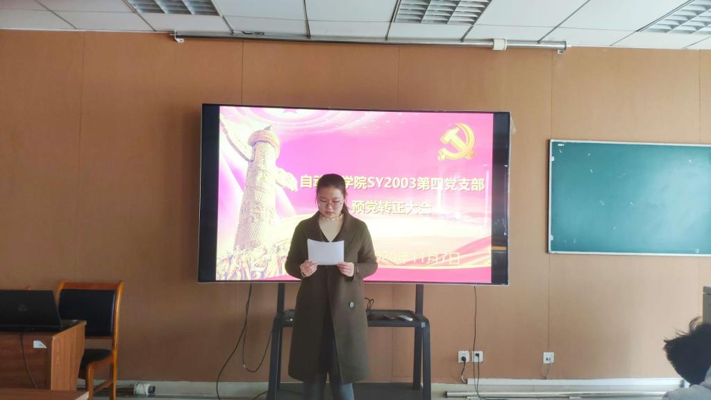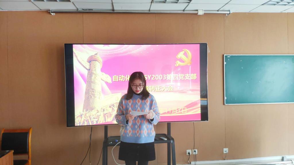 SY2003第四党支部预备党员转正大会顺利在E706教室召开,大会由支部书记姜琳琳同志主持。本支部共有正式党员12人,预备党员5人,今日有一人因病因事请假,共到场16人。此次大会讨论转正的同志分别是沈炜同志和邴璐同志,她们经过党组织为期一年的培养考察,已经达到转正的标准。