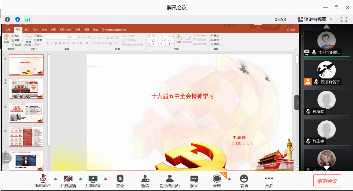 SY1903第七党支部召开了关于“十九届五中全会精神”的集中学习,通过线上会议的形式对十九届五中全会精神相关知识以及会议精神进行了学习与讨论。