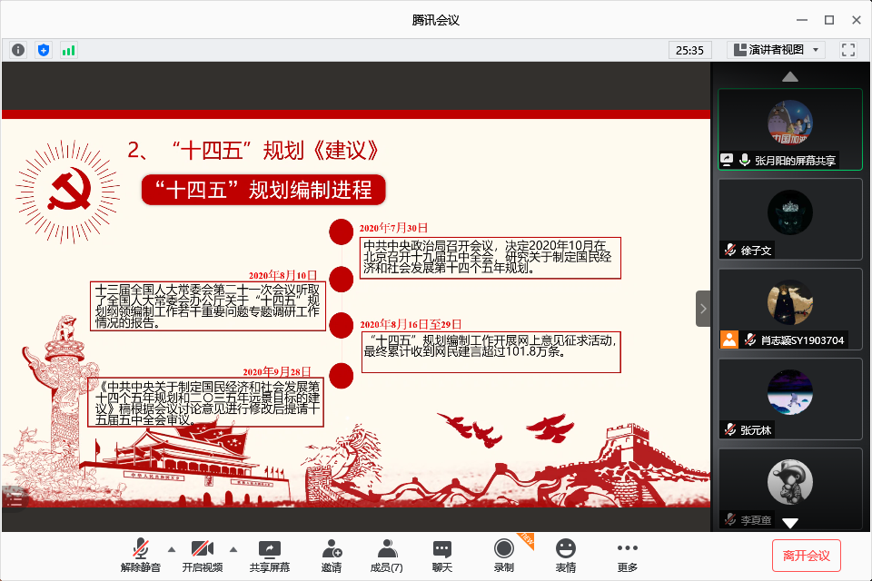 SY1903第八党支部依托腾讯会议平台,以线上的形式开展了本月的第一次“学习日”活动,主题为“聚焦十九届五中全会”。本次活动由肖志颖同志主持,支部成员全体参加活动。