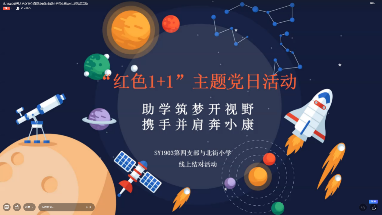 研究生党支部与山西省中阳县北街小学开展“红色1+1”结对主题党日活动。本次活动以“助力筑梦开视野,携手并肩奔小康”为主题,包括“北航之缘”、“三系之奇”、“京都之美”、“携手之行”四个部分的内容,以线上钉钉直播形式开展。北街小学党支部100余名教师、来自46个班级的2300余名学生、以及日本无码