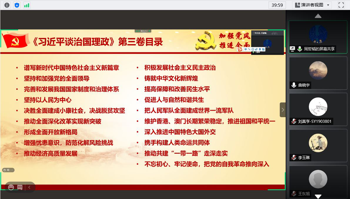 接下来,周哲韬同志带领大家学习了《习近平谈治国理政》第三卷,生动记录了党的十九大以来以习近平同志为核心的党中央,着眼中华民族伟大复兴的战略全局,不忘初心、牢记使命,统揽伟大斗争、伟大工程、伟大事业、伟大梦想,团结带领全党全国各族人民推动党和国家各项事业取得新的重大进展的伟大实践,集中展示了马克思主义中国化的最新成果,充分体现了我们党为推动构建人类命运共同体贡献的智慧方案,是全面系统反映习近平新时代中国特色社会主义思想的权威著作。