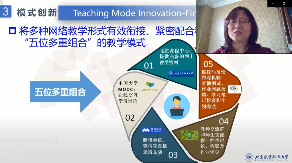 罕见的全球疫情对大学教学模式提出了新要求,面对新问题和重重困难,中心的多个教学团队坚定决心,探索教学新思路,构建并实施了“五位多重组合”的教学模式。该模式由五大部分构成:(1)依托北航课程中心等平台,提供完备的网上教学资料;(2)通过中国大学MOOC平台,开展线上教学和交流讨论;(3)通过腾讯会议、微信等平台进行直播/录播教学;(4)通过微信群进行师生讨论、答疑及作业辅导;(5)通过直播测试、作业问题反馈、学习笔记检查和个别沟通,建立教学监控与反馈跟踪机制。