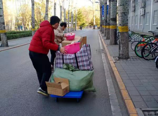活动伊始,按照高年级班级统计的搬宿舍人数,党支部委员和班委自发购买了一定的纸箱用于搬运。为了充分发挥党员带头作用,在党支部委员的指导下成立搬运活动小组,每个小组三人,由一名党员作为组长带领工作,并按照每组负责的人数有序的进行了纸箱分发,极大地提高了宿舍物品的装卸和搬运工作效率。通过活动分组,小组之间互相协作,同时还有效发挥了不同小组的主观能动性,各个小组在活动期间提出多种巧妙或灵活的搬运方法,高效高质量完成服务工作。如班长陈炼带领的小组去菜鸟驿站借来推车,不仅提高了搬运速度,减轻搬运劳动强度,同时积极帮助了其他小组,加深了同学之间互帮互助的情谊。