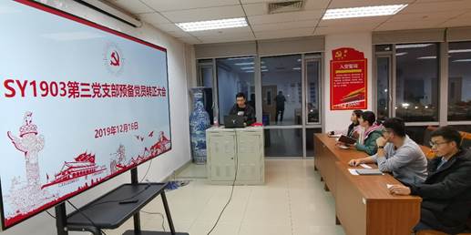 SY1903第三党支部在新主楼E706召开了预备党员转正大会,本次会议应到7人,实到7人。本次会议由党支书梅帅杰同志主持。
