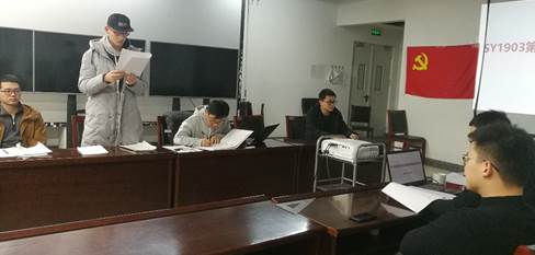 SY1903第九党支部于新主楼E307组织开展了接收预备党员大会。本次会议由党支部书记王泽同志主持,应到11人,其中正式党员8人,预备党员1人,发展对象2人;实到10人,其中正式党员7人,预备党员1人,发展对象2人,因事请假1人。到会有表决权的党员7人,超过本支部有表决权党员的半数,符合开会要求。