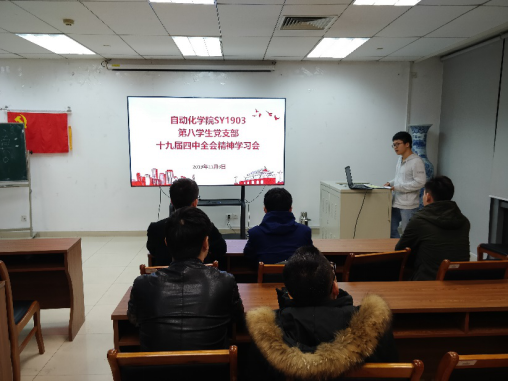 SY1903第八学生党支部在新主楼E座706顺利召开了十九届四中全会精神学习会,本次学习会由党支部书记肖志颖同志主持,应到6人,实到6人。