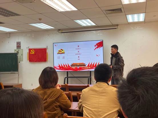 首先全体起立奏唱国际歌,之后校宣讲团讲师刘战强为大家带来“不忘初心,牢记使命”为主题的党课,党课主要结合老一辈革命家的初心使命对当今青年党员的影响展开,分为三个部分:什么是初心、如何坚守初心、结语。讲师讲到:“作为青年党员应当以国家富强民族发展为己任,不应将理想只局限于个人名利。”通过刘战强讲师的分享,我们了解到,在我党成立初期,构成支部的成员中大部分都是家境优渥的学者,只有少数是工人,他们虽然有着较好的物质条件,但在民族生死存亡的关键时刻愿意承担失去安稳生活的风险也要为国家为民族努力奋斗,而我们青年党员在新时代更应当发扬先辈们的优良品质。通过党课学习,在场的党员与积极分子充分认识到了作为青年党员当牢记自己的初心与使命。