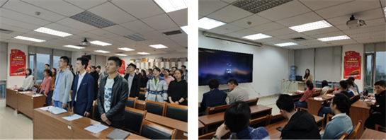 首先,全体起立奏唱国际歌。之后13位拟发展对象依次的进行答辩材料的宣讲,向党组织汇报自己的入党动机、思想状况以及生活学习等各方面的表现,然后由各位与会的支书支委进行提问并根据拟发展对象的基本情况提出自己的意见进行打分表决。