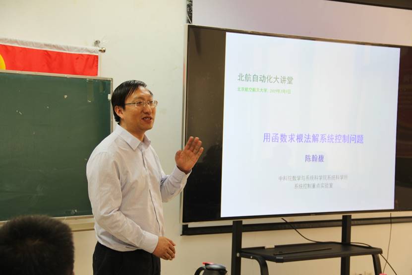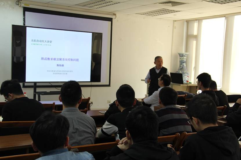 吕金虎院长向大家介绍陈翰馥院士,提到陈院士虽年过80,仍然奋战在科研第一线,近年来仍然会发表第一作者的文章。陈老坚持每天早上9点之前来到办公室,对待工作、科研孜孜不倦,让人敬佩。同学们对陈院士的到来表示热烈的欢迎。在随后的讲座中,陈翰馥院士没有给大家讲一些枯燥难懂的知识,他化繁为简,用简明生动的语言给大家讲解了函数求根法在系统控制方面的应用。他将系统控制问题的求解路线分为三步,然后通过具体例子介绍了用求根法求解系统控制问题。理论加上实例,加深了同学们对于问题的理解。