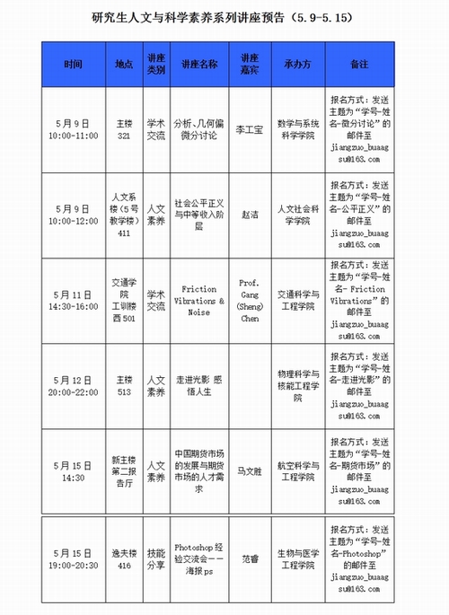 为提升我校研究生文化素养,培养研究生科学精神,促进研究生学术交流,营造具有传统与时代结合、人文与科学融合的研究生创新文化,党委研究生工作部于2016年3月启动我校研究生人文与科学素养提升平台建设。每周在校园网和研究生院官网上对近期即将举行的人文与科学素养讲座、报告或相关活动进行预告,欢迎感兴趣的同学积极参与。