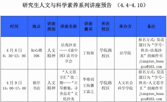 为提升我校研究生文化素养,培养研究生科学精神,营造具有传统与时代结合、人文与科学融合的研究生创新文化,党委研究生工作部于2016年3月启动我校研究生人文与科学素养提升平台建设。每周在研究生院官网上对近期即将举行的人文与科学素养讲座、报告或相关活动进行预告,欢迎感兴趣的同学积极参与。