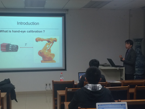 潘辉、丁帅、唐荻音、硕士王虎、崔梦曦、陈潜等分别就“A closed-Form Solution to 3D Eye-to-Hand Calibration towards Visual Grasping”,“基于单目视觉的高精度空间合作目标相对位姿估计”,“肌机接口中基于稀疏贝叶斯学习的特征提取”,“Condition-Based Maintenance for a periodically Inspected System Subject to Soft and Sudden Failure”,“An adaptive denoising algorithm of remote sensing image”,“Design and Analysis of Cable-Driven Parallel Robot for Urban Search and Rescue”,“平板导体厚度涡流检测的两种反演方法”做学术报告。