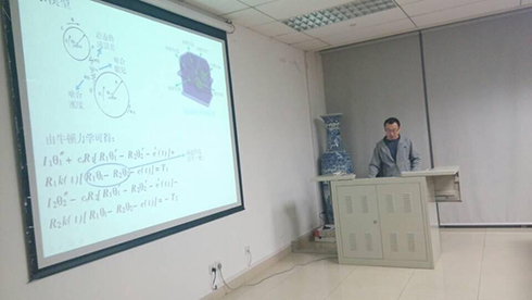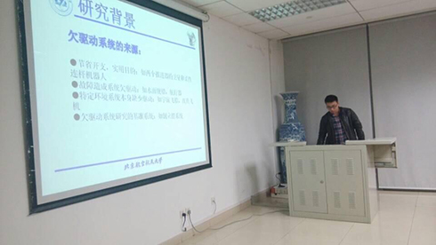 最后为大家讲解的是胡亚强硕士,他的研究方向是飞行器控制和计算机控制。他首先介绍了欠驱动系统的概念,以及他实验所用的欠驱动倒立摆系统。他在设计中应用变结构滑模控制和神经网络理论,并且利用线性反馈化技术,设计了自适应神经滑模控制器。并利用Lyapunov稳定性理论,证明了控制器的稳定性。报告过程中,他减少对于理论推导的介绍,而是主要讲解了解决问题的过程,让人印象深刻。