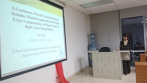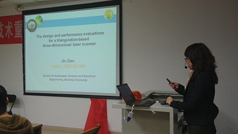 作了报告,她首先介绍了三维激光扫描仪设计的背景和深入研究的意义,并详细介绍了自己课题中新型三维激光扫描仪的设计原理,实验测试过程,性能评估,并介绍连续小波变换模极大值方法的误差补偿来提高激光测距精度和可靠性的方法。