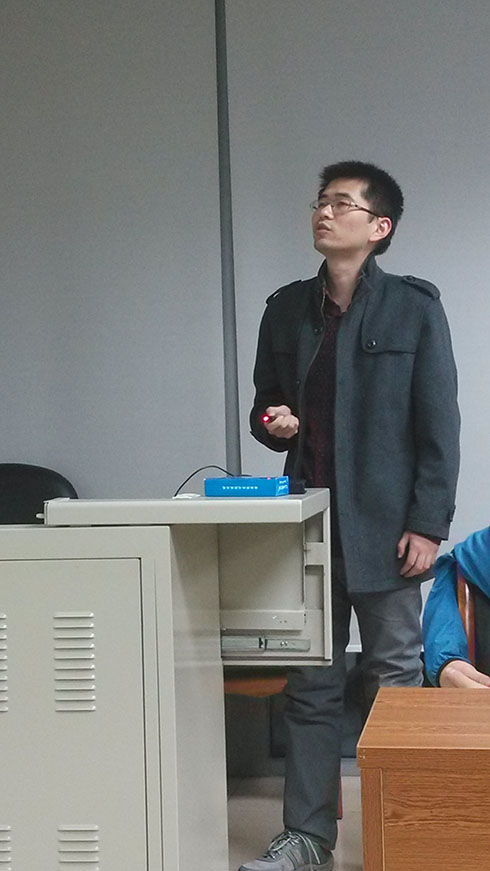 研究生祝国强,杨东,硕士研究生任传麒、桑 云、张生、韩静雅分别就“带输入非线性的高超声速飞行器自适应控制”“Image deblurring using content aware information and image detail enhancing”“基于模型预测控制的逆变器共模干扰抑制研究”“A route planning algorithm for UAV to intercept moving target in the environment with dynamic obstacles”“The Dynamic Sliding Mode Servo Control of Voice Coil Motor Under Gravity Disturbance”“基于视觉的无人机感知与规避系统设计”做学术报告。